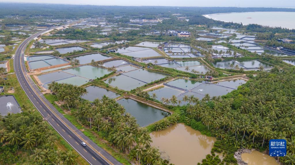車(chē)輛行駛在海南省瓊海市潭門(mén)鎮魚(yú)蝦塘邊的海濱旅游公路上(2022年5月3日攝,無(wú)人機照片)。