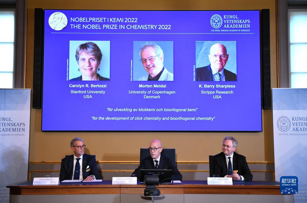 瑞典皇家科學(xué)院5日宣布,將2022年諾貝爾化學(xué)獎授予美國科學(xué)家卡羅琳·貝爾托齊、卡爾·巴里·沙普利斯和丹麥科學(xué)家莫滕·梅爾達爾,以表彰他們在發(fā)展點(diǎn)擊化學(xué)和生物正交化學(xué)方面的貢獻。