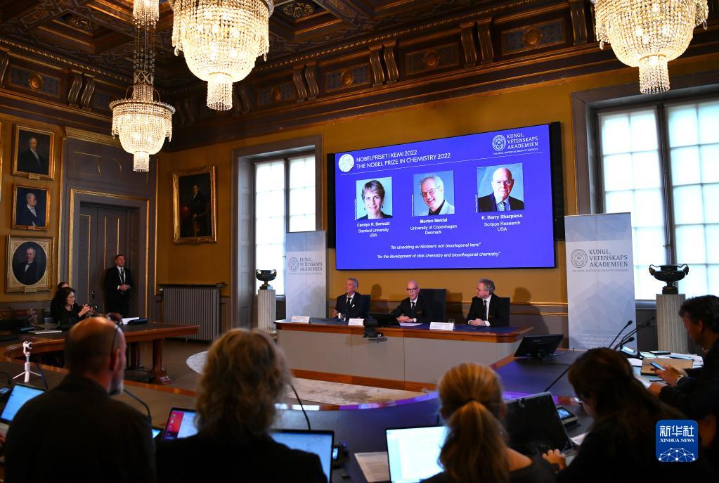 這是10月5日在瑞典斯德哥爾摩拍攝的2022年諾貝爾化學(xué)獎公布現場(chǎng)。