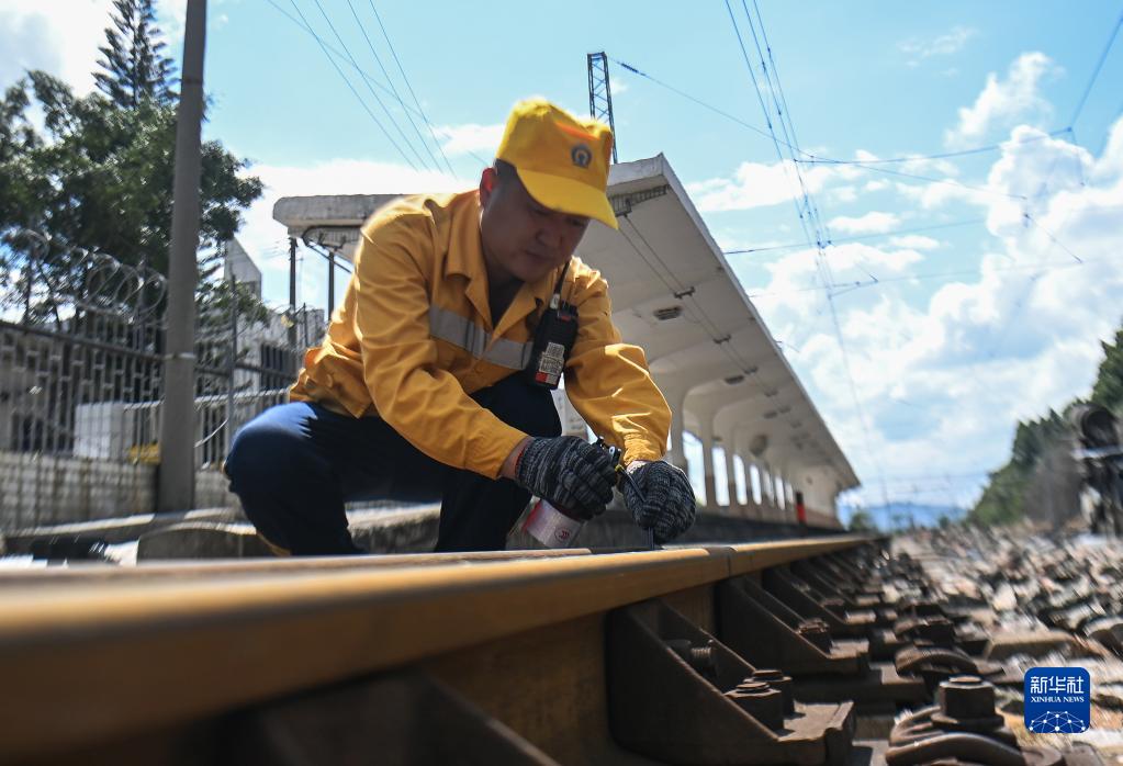 在百色車(chē)務(wù)段冊亨站,張天鵬在清掃道岔并注油(10月5日攝)。