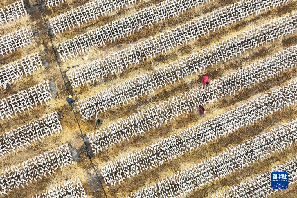 10月6日,村民在貴州省黔東南苗族侗族自治州岑鞏縣水尾鎮新場(chǎng)村黑木耳基地勞作(無(wú)人機照片)。