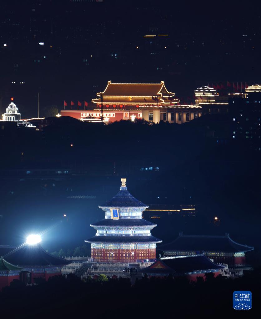 當日北京天氣晴好,夜色下,地標性建筑宏偉壯觀(guān)。