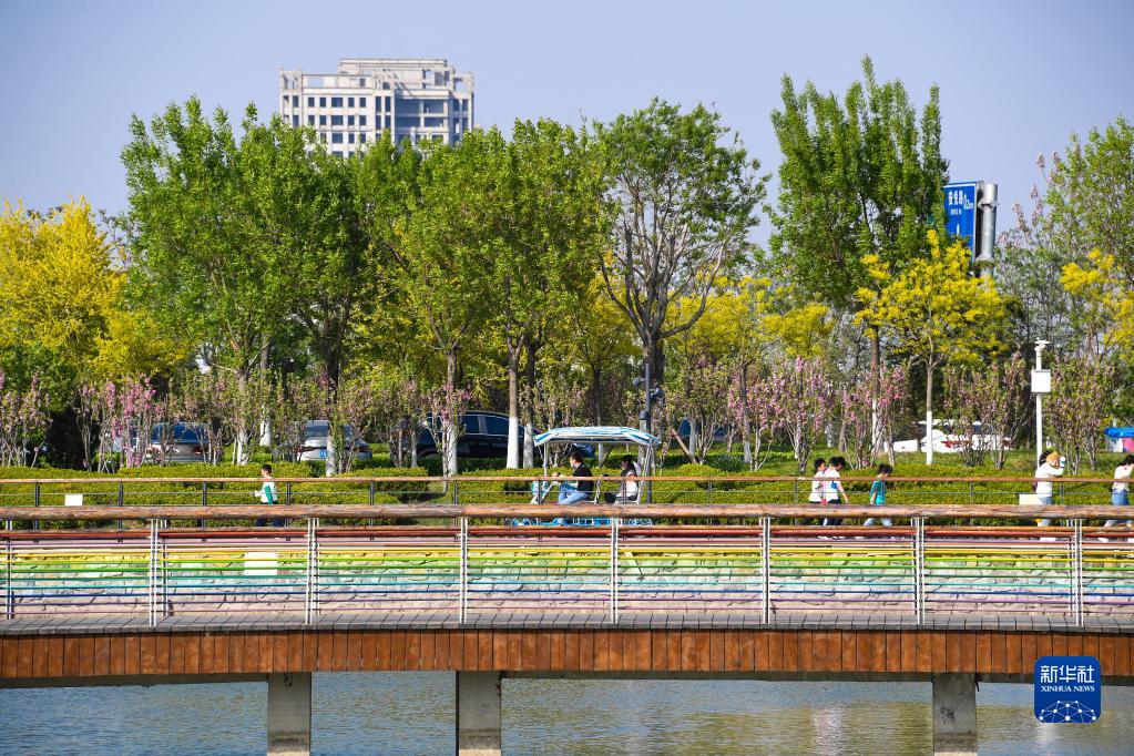 居民在天津市濱海新區中新天津生態(tài)城南堤濱海步道公園散步(2022年4月23日攝)。