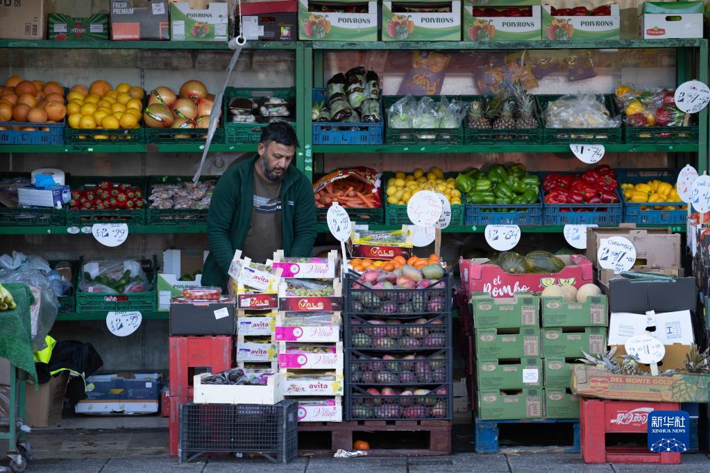 10月7日,一名商販在英國曼徹斯特街頭售賣(mài)水果。