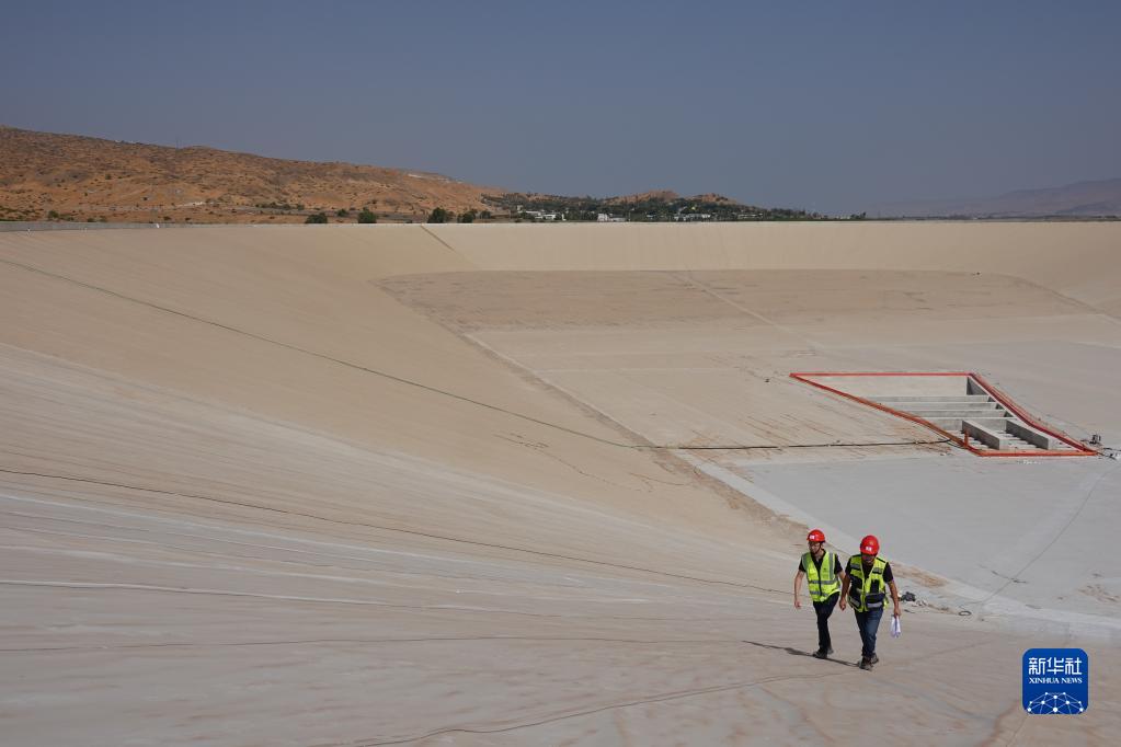 10月4日,中國電建工作人員在以色列東北部貝特謝安市的抽水蓄能電站新完工的下水庫現場(chǎng)。