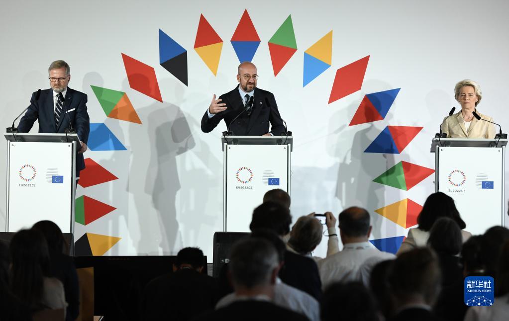 10月7日,在捷克首都布拉格,歐盟輪值主席國捷克總理菲亞拉(左)、歐洲理事會(huì )主席米歇爾(中)和歐盟委員會(huì )主席馮德萊恩出席歐盟領(lǐng)導人非正式會(huì )議的會(huì )后聯(lián)合新聞發(fā)布會(huì )。