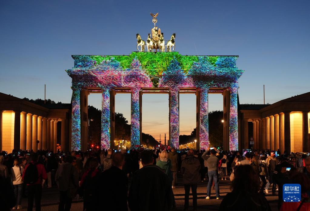 10月7日,德國柏林勃蘭登堡門(mén)被燈光點(diǎn)亮。柏林燈光節于10月7日至16日舉行。燈光節期間,柏林市內多個(gè)地標和建筑物將被燈光和裝置藝術(shù)品裝飾。新華社發(fā)(斯特凡·蔡茨攝)
