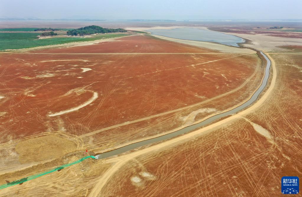 在江西省都昌縣,鄱陽(yáng)湖主航道的水通過(guò)水泵抽水與人工水渠的接力,輸入朱袍山區域的碟形湖中(9月28日攝,無(wú)人機照片)。