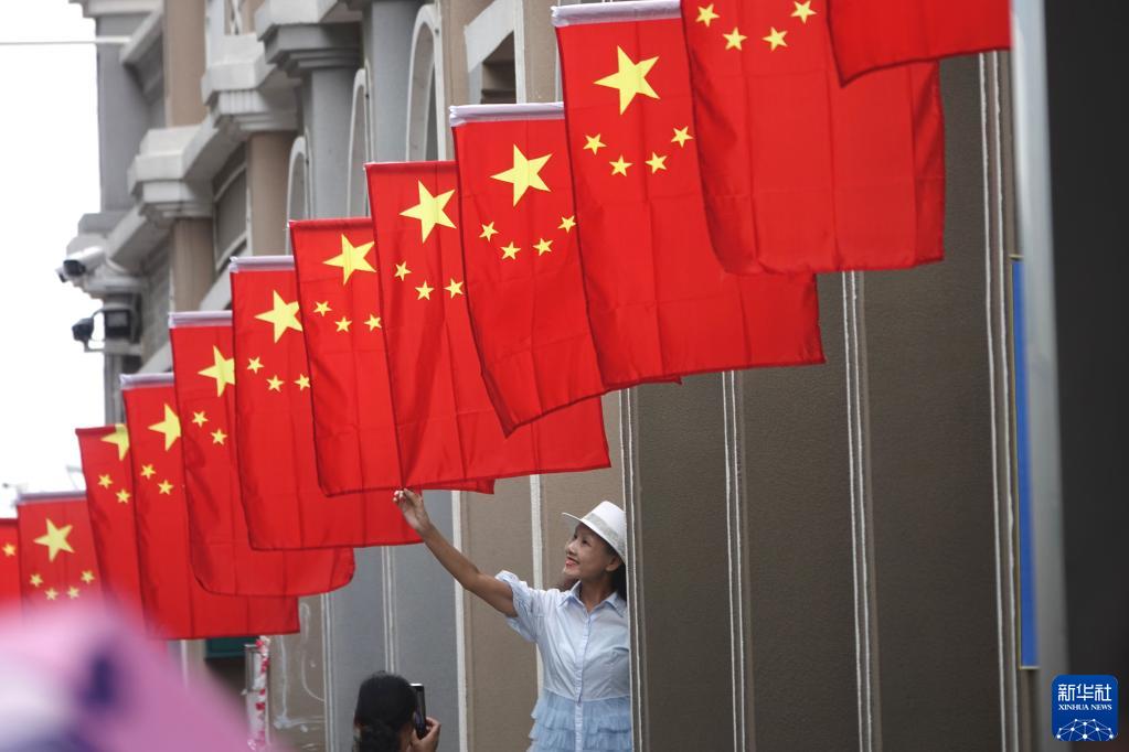 10月1日,一名市民在廣西南寧市朝陽(yáng)廣場(chǎng)步行街與懸掛的國旗合影。