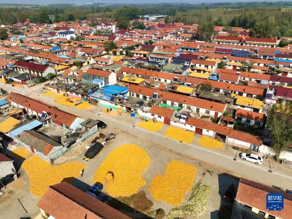 金秋十月,各地農民搶抓農時(shí),晾曬收獲的玉米、稻谷等,鄉間呈現出金色的豐收圖景。