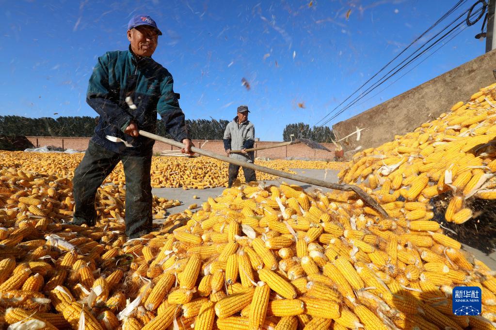 10月9日,在河北省石家莊晉州市周家莊鄉第七生產(chǎn)隊,農民將收獲的玉米卸車(chē)晾曬。
