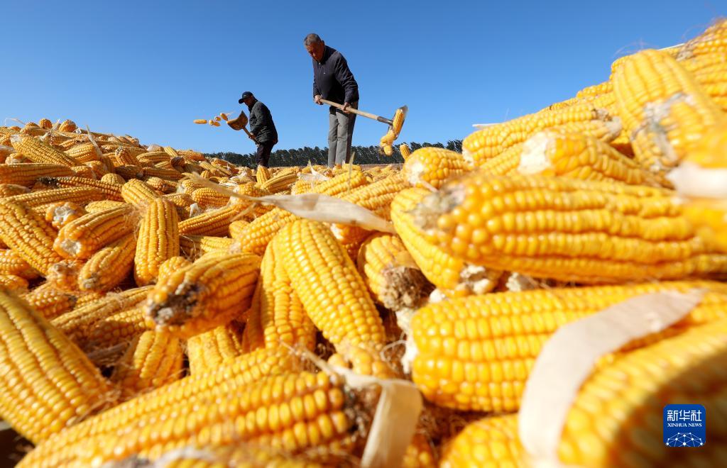 10月9日,在河北省石家莊晉州市周家莊鄉第七生產(chǎn)隊,農民在晾曬收獲的玉米。