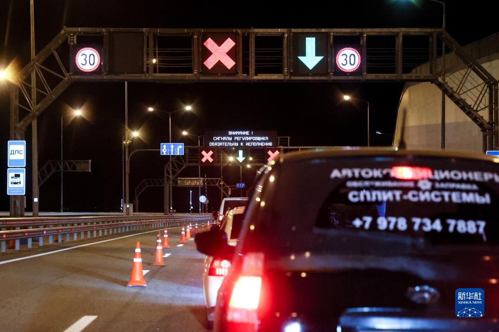 10月9日,汽車(chē)排隊通過(guò)克里米亞大橋。