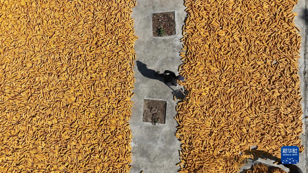 10月9日,農民在山東省聊城市茌平區杜郎口鎮張莊村晾曬玉米(無(wú)人機照片)。