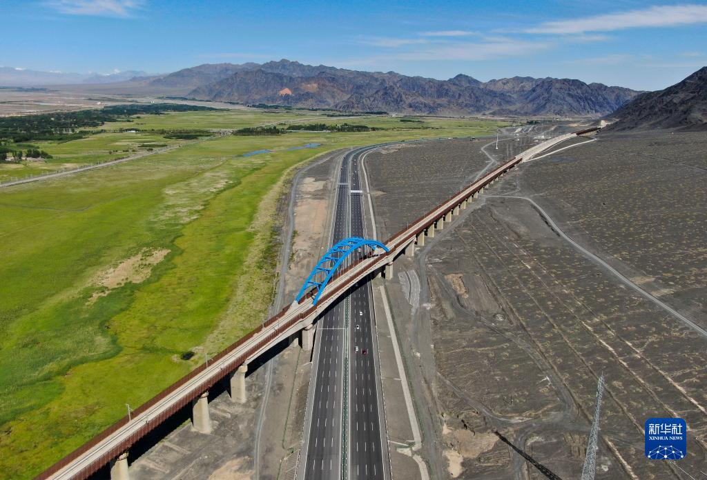 連(云港)霍(爾果斯)高速公路新疆小草湖至烏魯木齊段從蘭新鐵路下方穿過(guò)(2020年7月1日攝,無(wú)人機照片)。
