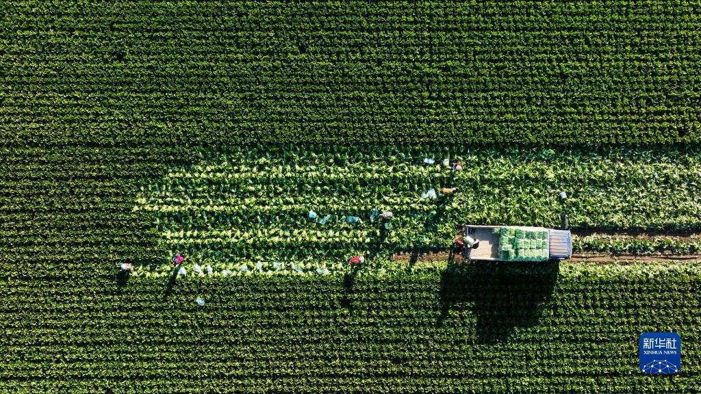 10月10日,河北省玉田縣虹橋鎮的農民將收獲的白菜裝車(chē)外運(無(wú)人機照片)。