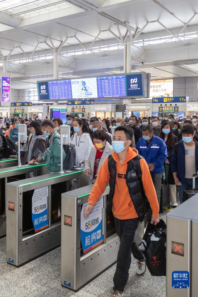10月11日,在上海虹橋火車(chē)站,旅客通過(guò)檢票閘機進(jìn)站。