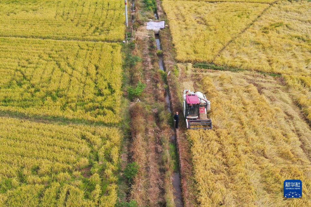 10月11日,工作人員在示范區收割稻谷(無(wú)人機照片)。