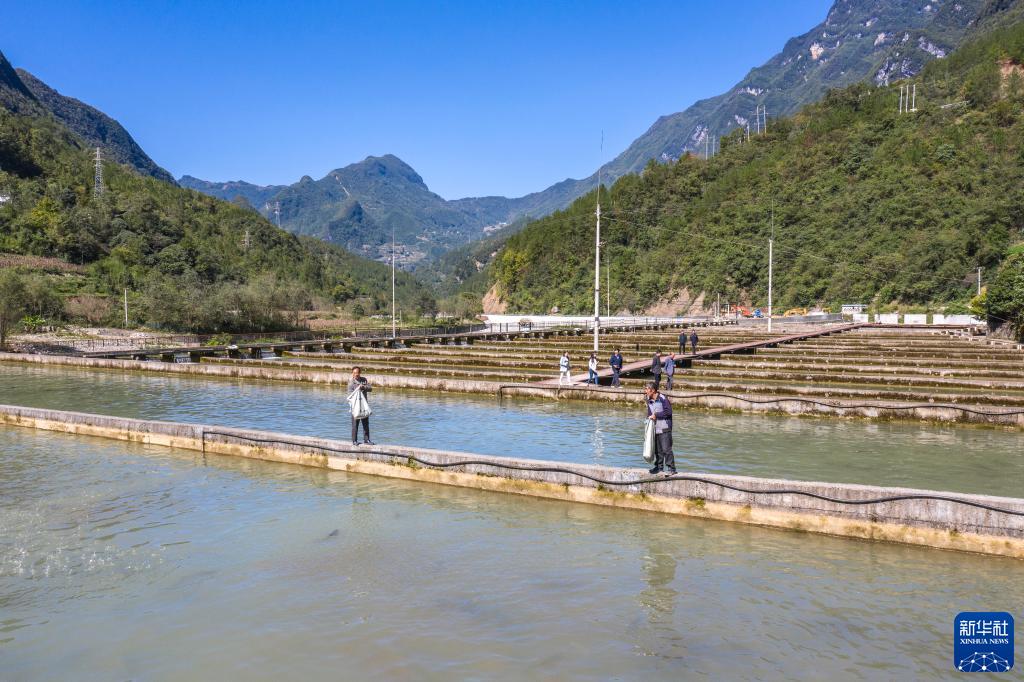 10月11日,在重慶市城口縣蓼子鄉明安村冷水魚(yú)產(chǎn)業(yè)基地,工作人員為虹鱒魚(yú)投喂魚(yú)食(無(wú)人機照片)。