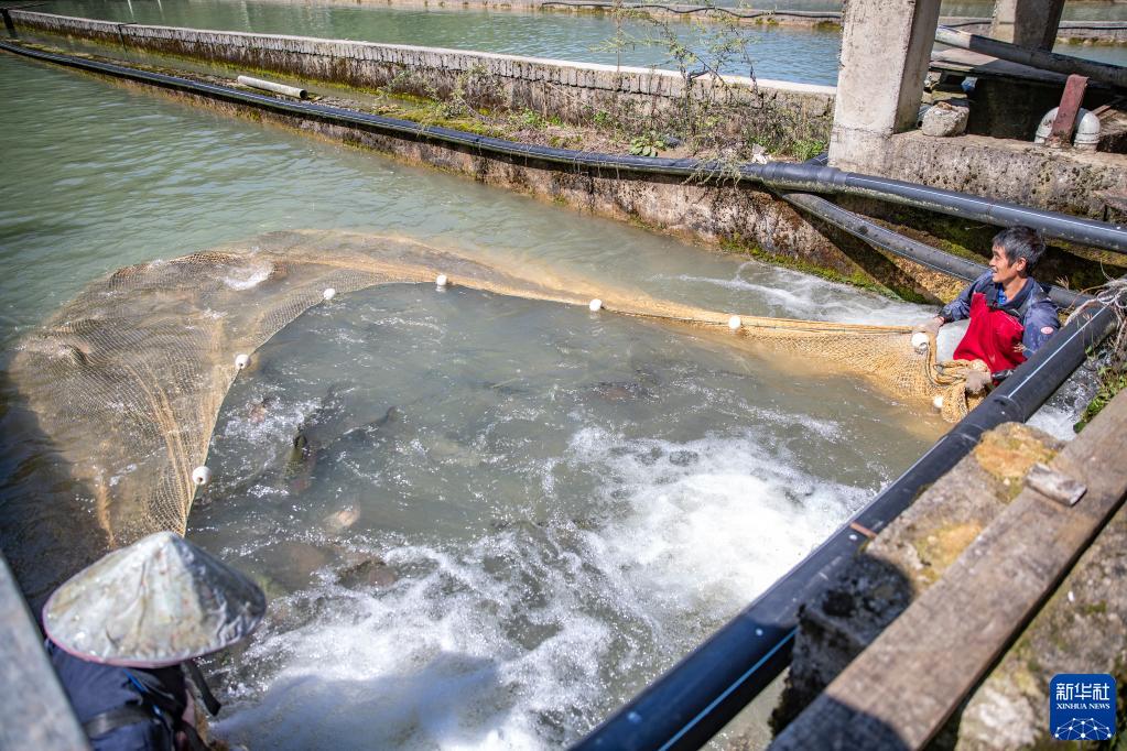 10月11日,在重慶市城口縣蓼子鄉明安村冷水魚(yú)產(chǎn)業(yè)基地,工作人員在捕撈準備出售的虹鱒魚(yú)。