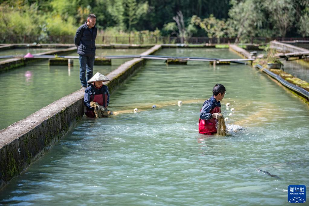 10月11日,在重慶市城口縣蓼子鄉明安村冷水魚(yú)產(chǎn)業(yè)基地,工作人員在捕撈準備出售的虹鱒魚(yú)。