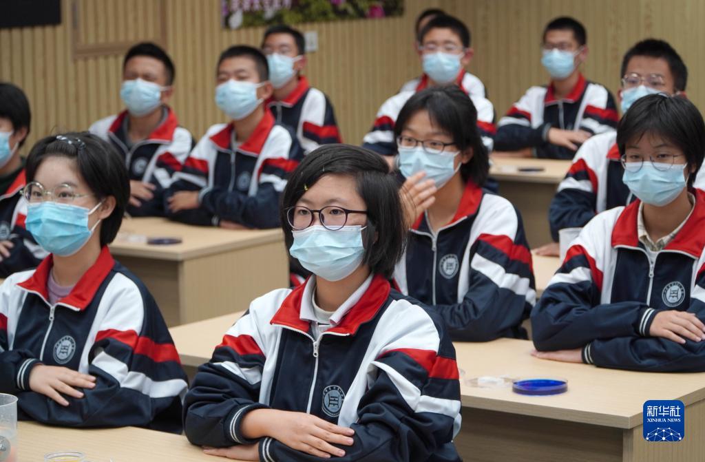 10月12日,學(xué)生在山東省菏澤第一中學(xué)收看“天宮課堂”第三課。 新華社記者 徐速繪 攝