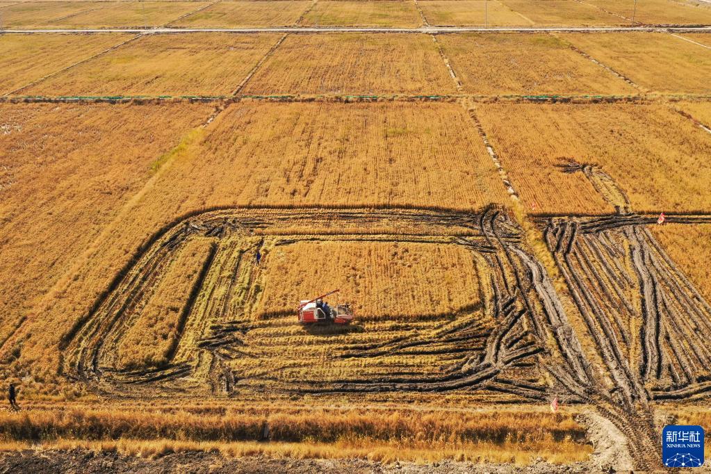 在大安市海坨鄉鹽堿地生態(tài)修復治理示范基地,農民駕駛收割機收割水稻(無(wú)人機照片,10月12日攝)。