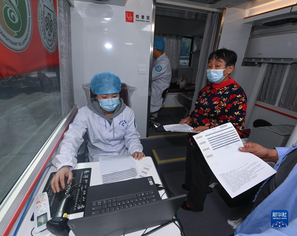10月13日,移動(dòng)體檢車(chē)上的醫生為丁家港村的村民體檢。