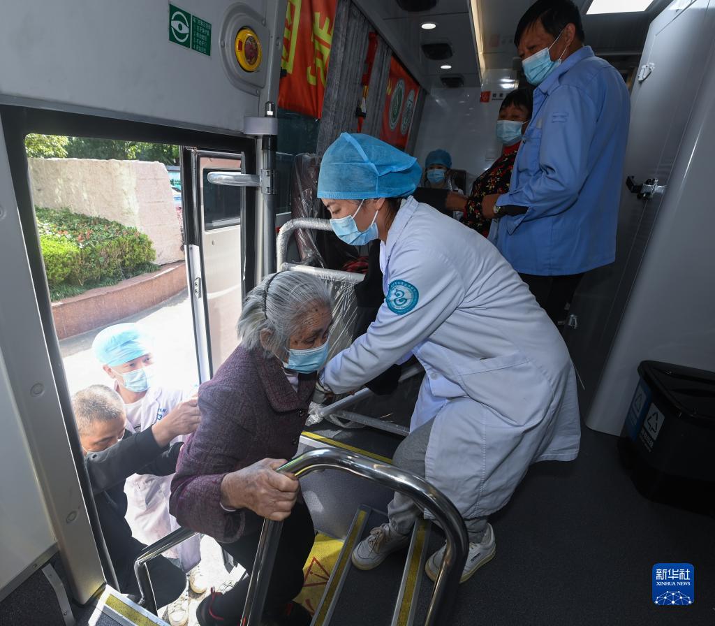 10月13日,丁家港村88歲的方鳳金(中)在護士和家人的幫助下進(jìn)入移動(dòng)體檢車(chē),準備進(jìn)行體檢。