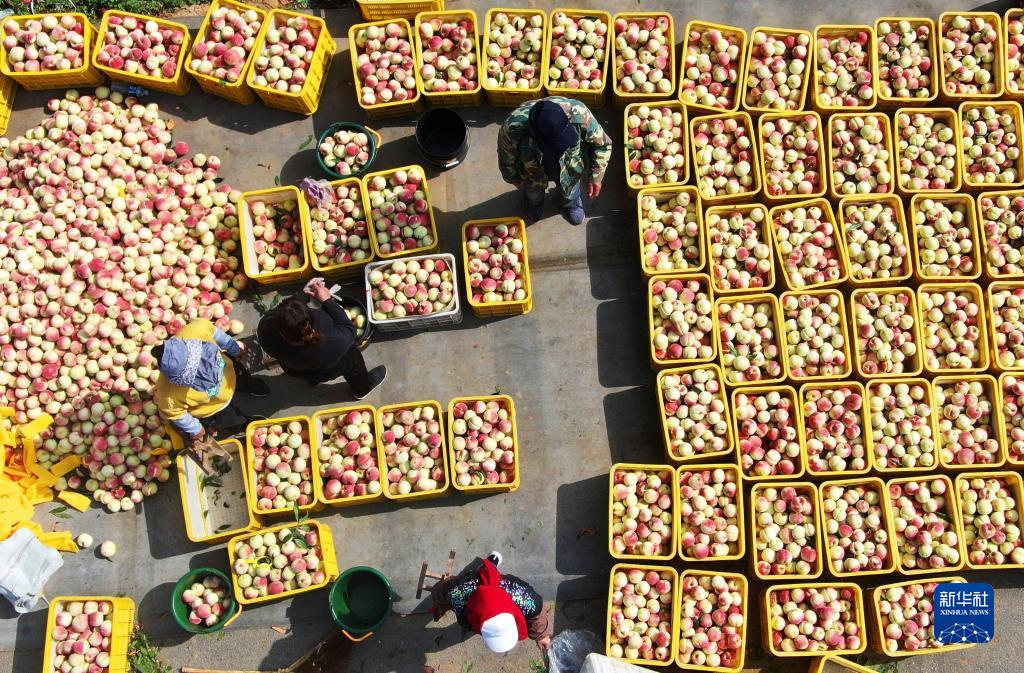 10月13日,在山東萊西市南墅鎮袁家村,果農在分揀冬桃(無(wú)人機照片)。