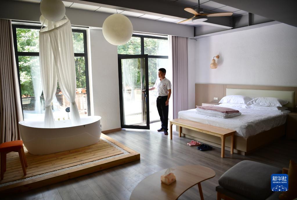 西安市鄠邑區石井街道栗峪口村駐村干部劉帥在查看新建成民宿的房間布置(2022年7月21日攝)。