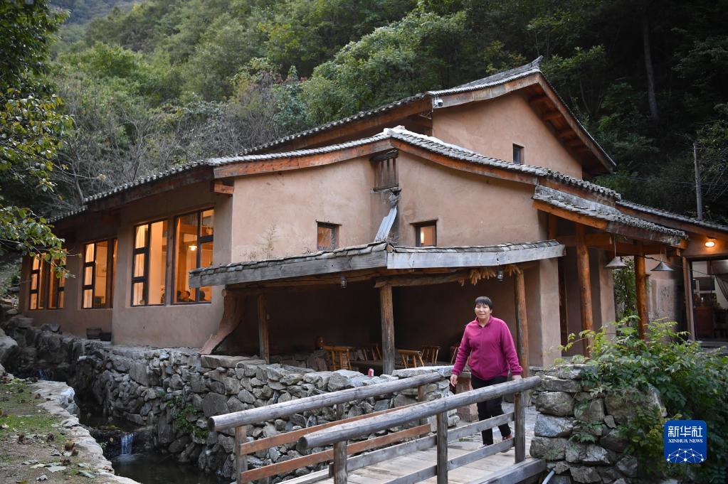 陜西寧陜縣廣貨街鎮沙溝村村民張勝霞在民宿院子里(2022年10月9日攝)。這處民宿由她家的舊房改造而來(lái)。