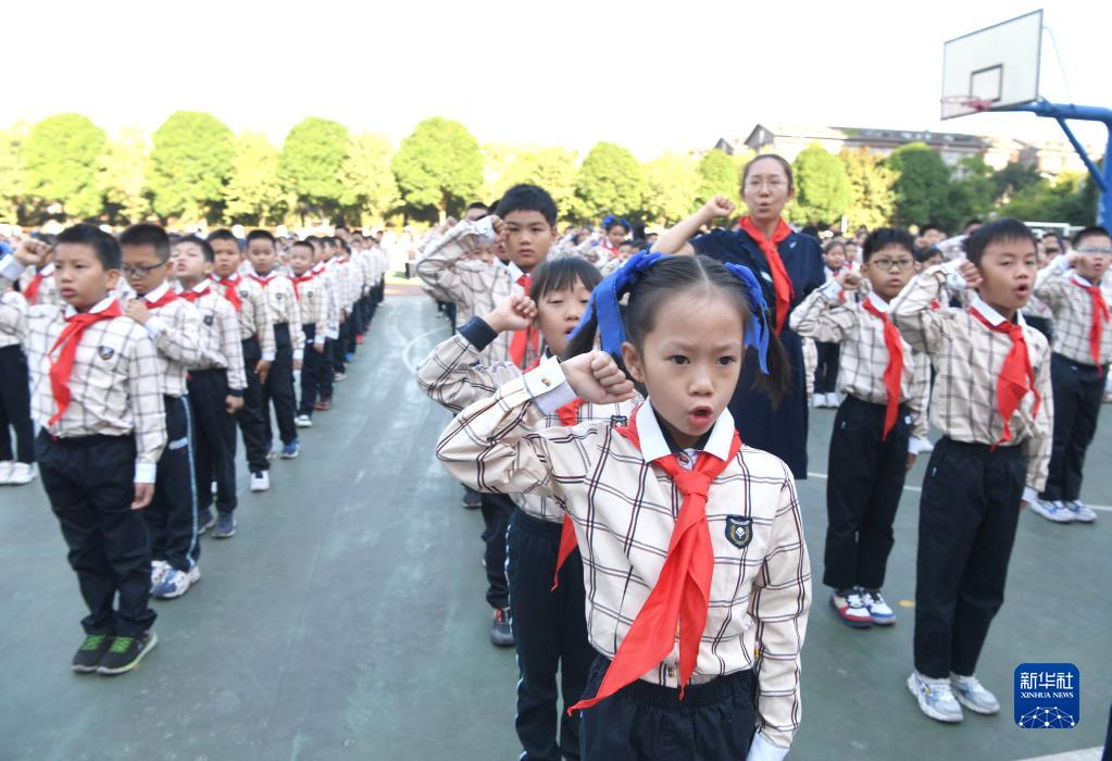 當日是中國少年先鋒隊建隊73周年紀念日,廣西南寧市濱湖路小學(xué)舉行新隊員入隊儀式,497名小學(xué)生系上紅領(lǐng)巾,光榮加入中國少年先鋒隊。