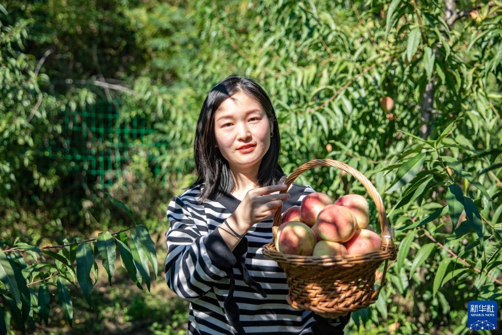 10月13日,在重慶市巫溪縣峰靈鎮譚家村,一名游客在展示自己采摘的冬桃。