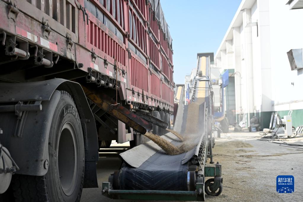 10月13日,在中央儲備糧合肥直屬庫有限公司本部,稻谷被傳送帶轉運至倉房?jì)取?/p>