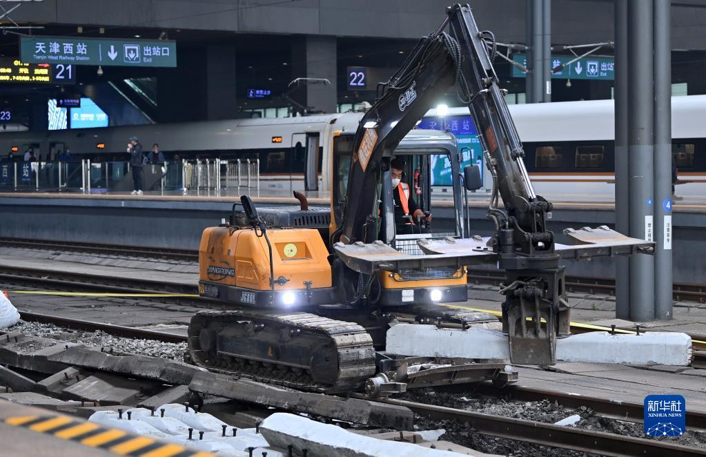 10月14日,施工者在天津西站操作機械設備進(jìn)行換枕作業(yè)。