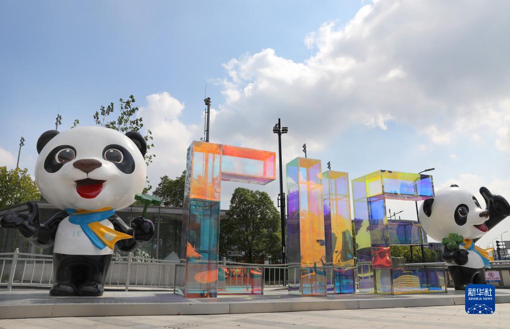 這是國家會(huì )展中心(上海)北入口外的進(jìn)博主題裝飾(10月15日攝)。