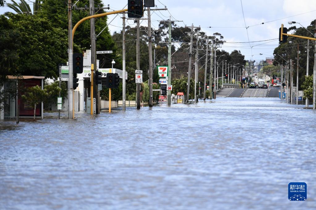 這是10月14日在澳大利亞維多利亞州拍攝的被洪水淹沒(méi)的街道。