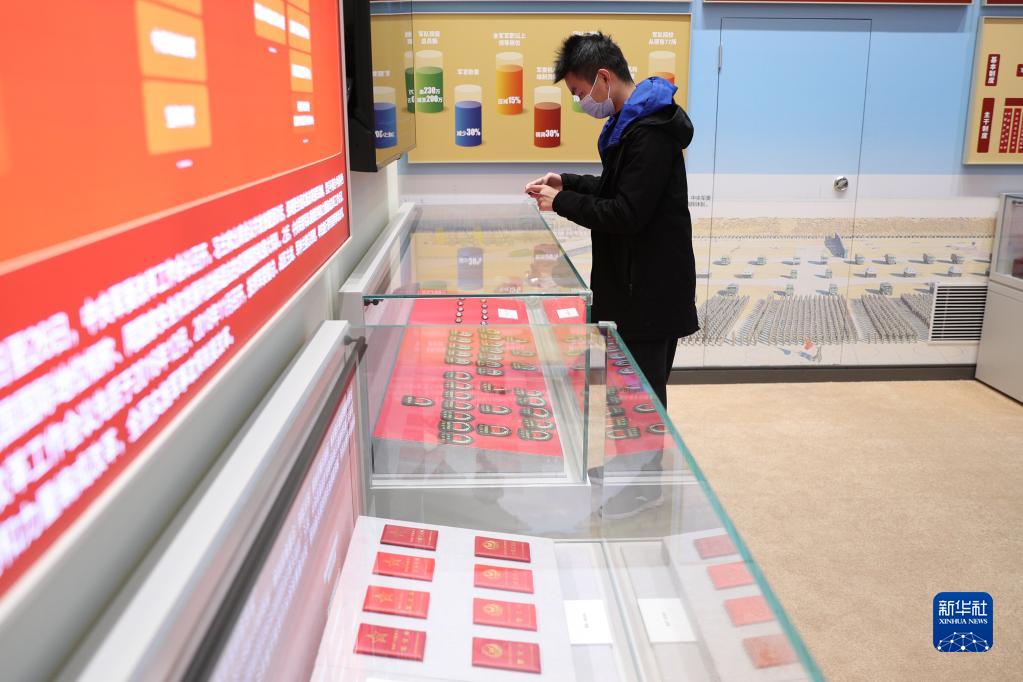 觀(guān)眾在“奮進(jìn)新時(shí)代”主題成就展第八單元“堅持走中國特色強軍之路 全面推進(jìn)國防和軍隊現代化”展廳拍攝解放軍和武警部隊21式作業(yè)服臂章、胸標(10月12日攝)。新華社記者 許雅楠 攝
