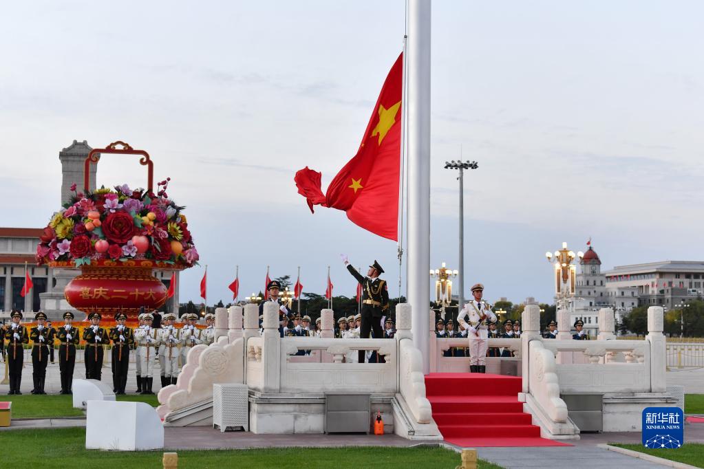 10月16日清晨,北京天安門(mén)廣場(chǎng)舉行升國旗儀式。