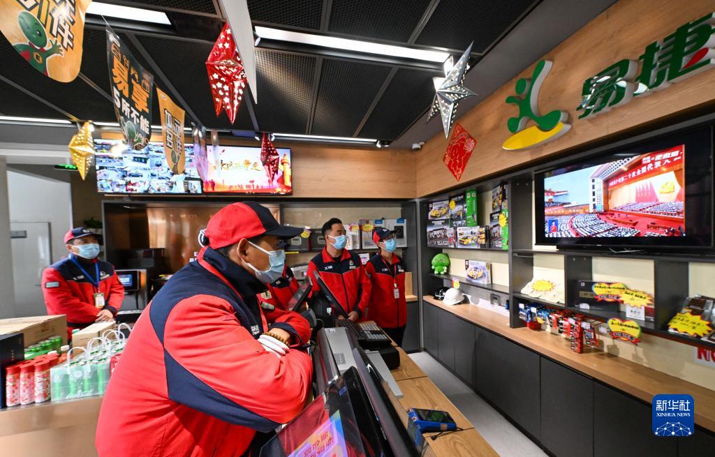 10月16日,在位于天津市南開(kāi)區的中國石化銷(xiāo)售股份有限公司天津石油分公司長(cháng)江道加油站,工作人員在工作間隙觀(guān)看開(kāi)幕會(huì )直播。