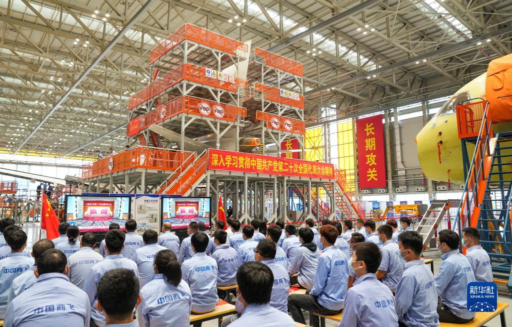 10月16日,在中國商飛上海飛機制造有限公司總裝車(chē)間,員工們在收看中國共產(chǎn)黨第二十次全國代表大會(huì )開(kāi)幕會(huì )。新華社記者 丁汀 攝
