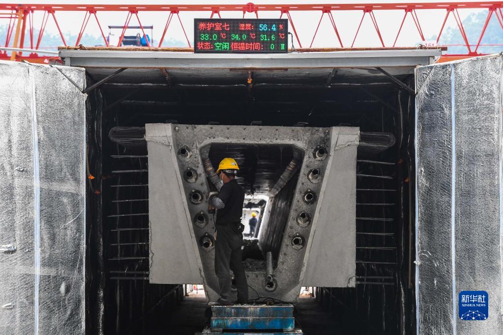 10月18日,工人對一片剛完成智能蒸養的預制箱梁進(jìn)行銜接面打毛。完成混凝土澆筑的預制箱梁需要進(jìn)行蒸養作業(yè),以增加結構強度。