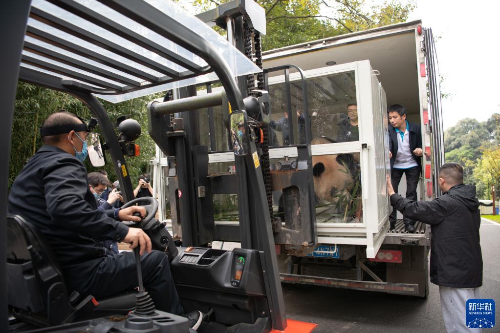10月18日,在中國大熊貓保護研究中心雅安基地,工作人員將大熊貓“京京”轉移至車(chē)上。