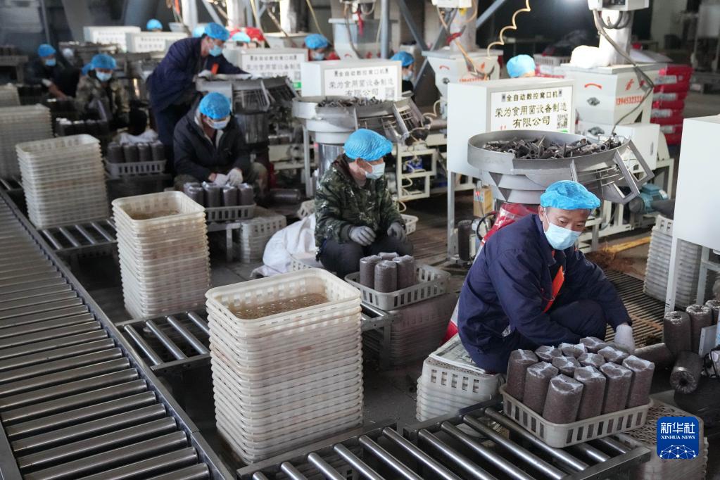 10月17日,在黑龍江省拜泉縣的鑫鑫菌業(yè)菌包生產(chǎn)車(chē)間,工人在生產(chǎn)菌包。