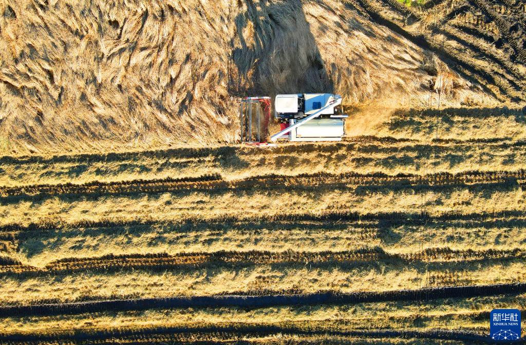 10月18日,在遼寧沈陽(yáng)市沈北新區興隆臺鎮青年農場(chǎng),收割機在收割水稻(無(wú)人機照片)。