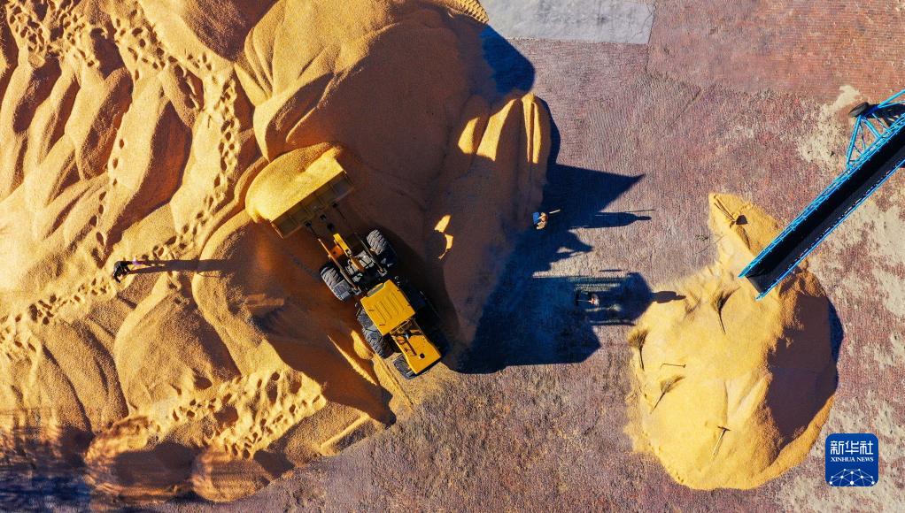 10月18日,在通遼市奈曼旗新鎮舍布日圖嘎查,工人在收糧站晾曬玉米(無(wú)人機照片)。
