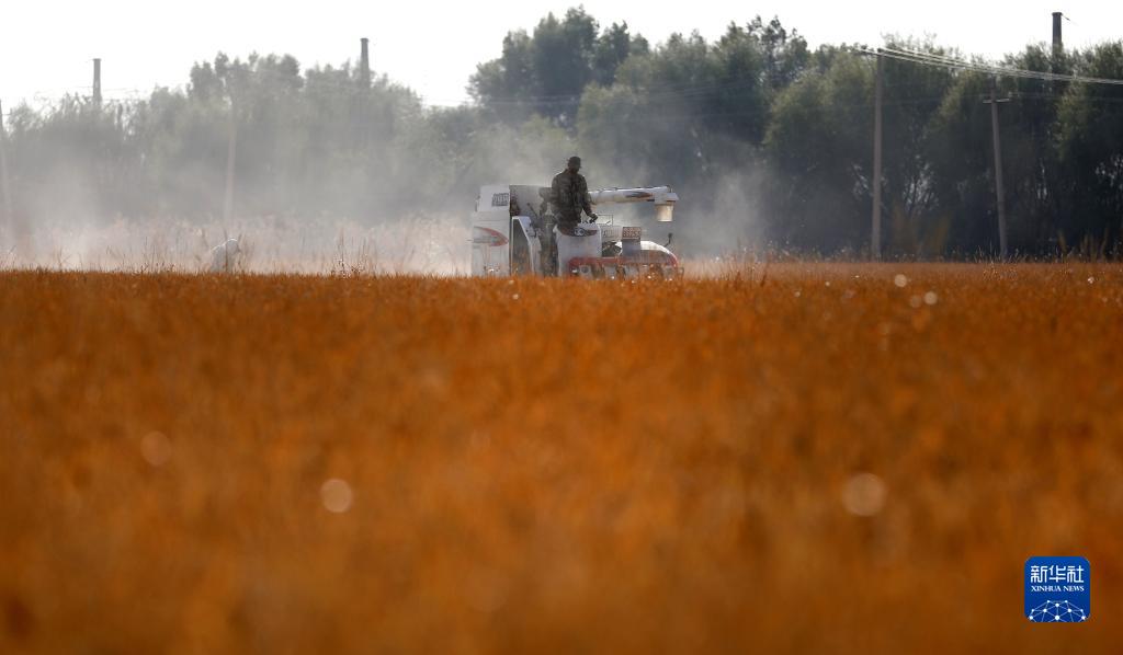 10月19日,在沈陽(yáng)市蘇家屯區林盛街道沙河站村,村民駕駛收割機收割水稻。