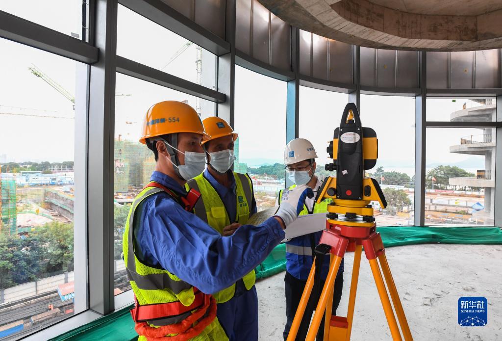 由中建深裝承建的央企中國電子總部大廈進(jìn)入幕墻同步安裝階段,技術(shù)人員在對首片弧面幕墻玻璃進(jìn)行放線(xiàn)測量(10月19日攝)。