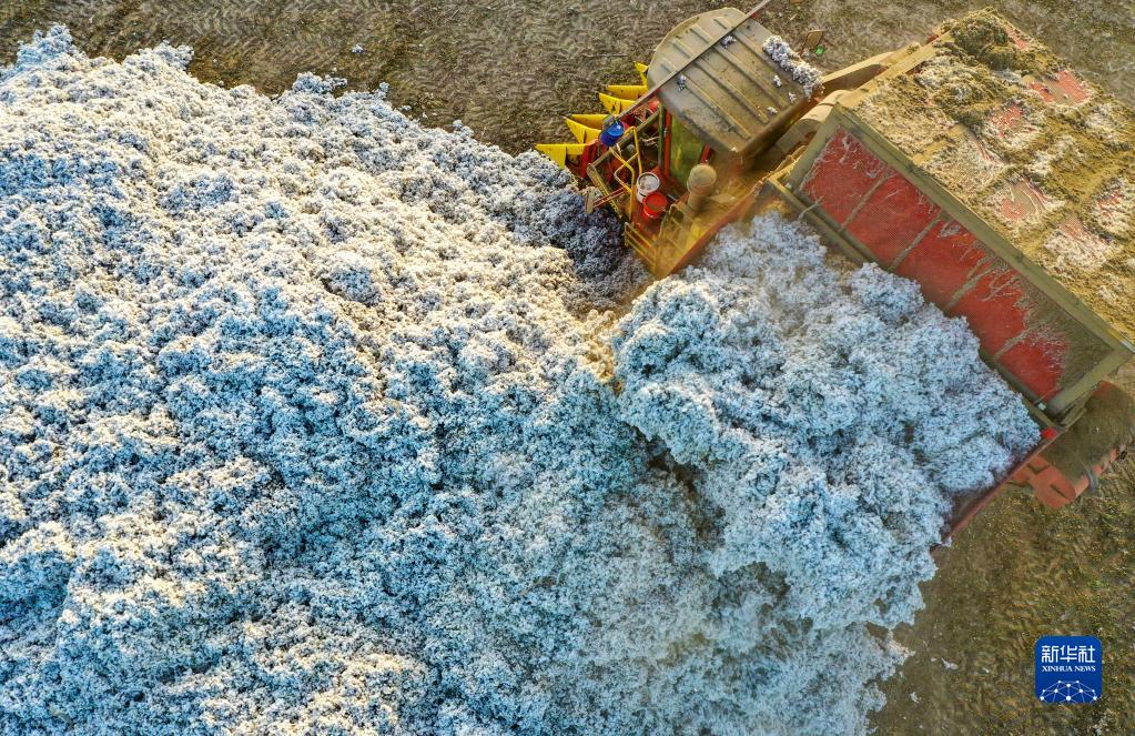 在新疆沙雅縣紅旗鎮一處棉田里,采棉機在卸棉(10月17日攝,無(wú)人機照片)。